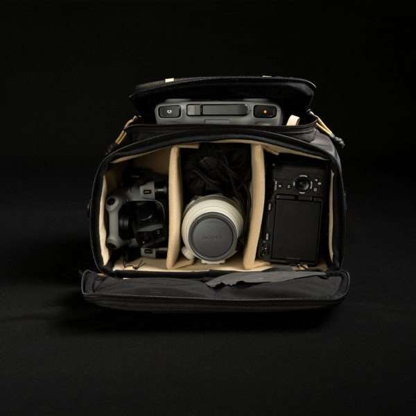 Un sac bandoulière professionnel pour garder votre appareil photo, vos objectifs et votre matériel prêts à photographier en quelques secondes. C'est un poste de travail portable que vous pouvez porter ou poser rapidement pour prendre des photos.